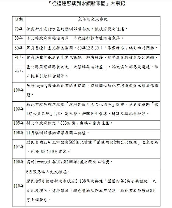 夷將Icyang說,溪洲聚落家屋於確保安全原則下,已於距離原居住地約100公尺處興建完成,至未來族人原來居住的地方將騰空,新北市政府運用原民會補助的經費,在原地興建聚落文化展演區域、特色餐廳、阿美族傳統家屋展示及停車空間,營造聚落新意象,原民會將協助新北市政府儘速完工,也會持續協助聚落結合長照、產業、族語教學、文化健康站等資源,讓原住民族文化能在城市立地生根與發展。