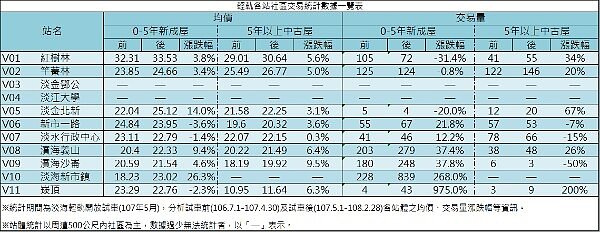 107年12月底始正式通車的淡海輕軌。(圖/新北市府) 輕軌沿線圖。 輕軌各站社區交易統計數據一覽表。(圖/新北淡水地政事務所) 由統計數據可知,0至5年內新成屋除紅樹林站(V01)因施工時之交通黑暗期影響外,其餘站體周邊交易量大致呈現上漲趨勢。其中紅樹林站因屬捷運淡水線紅樹林站也是淡海輕軌起站,緊臨淡水河紅樹林,多為河岸景觀宅,成交均價也是淡海輕軌沿線最高,每坪約在32至33萬之間。 新市一路站(V06)及淡水行政中心站(V07) 因鄰近淡水行政中心周邊為淡海新市鎮生活機能最為完善區域,均價約在每坪23至25萬元間。至於淡海輕軌後段之濱海沙崙站(V09)、淡海新市鎮站(V10)及崁頂站(V11),因位於淡海新市鎮中心商業區附近,且緊鄰商城影城、百貨,周邊生活機能逐漸發展,近期多為千戶以上之大型建案,成交均價及交易量漲幅明顯,均價約在每坪21至23萬元之間。 至於5年以上之中古屋交易多集中於紅樹林站(V01)、竿蓁林站(V02) 、新市一路站(V06)、淡水行政中心站(V07) 及濱海義山站(V08)等站,紅樹林站因具雙捷交匯優勢且有臨海景觀,中古屋均價多在每坪30萬元以上水準,其餘淡海新市鎮內的新市一路站(V06)、淡水行政中心站(V07) 及濱海義山站(V08)等站,成交均價約在每坪20至22萬元之間。 而交易量及單價最低者為崁頂站(V11),每坪均價約在11萬元上下,主因本站位置相對偏遠、週邊建案較少,生活機能尚在發展中。綜上所述,以淡海輕軌試車時間點為標準,其沿線各站周邊房地產交易案量及成交均價多呈現正成長之趨勢。 淡水地政事務所主任許才仁表示,淡海輕軌去年年底通車後,沿線房市交易討論熱絡,並深受首購族及年輕人青睞,再加上近年來淡海新市鎮內之輕軌藍海線及淡江大橋等各項建設利多皆持續進行中,未來交通、生活機能將更趨完善,預期可成為更宜居之環境。