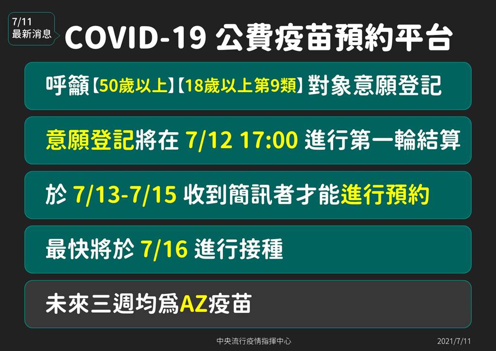疫苗登記意願平台已啟用多日,行政院政委唐鳳今出席中央流行疫情指揮中心表示,疫苗登記已全國性啟用,並於7月12日下午17時收單,第9、10類人最快可於7月16日接種,唐鳳也提醒,若勾選AZ疫苗可加速施打。